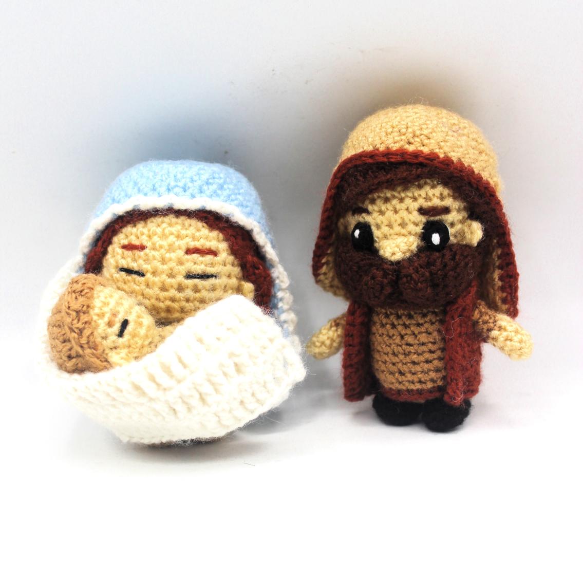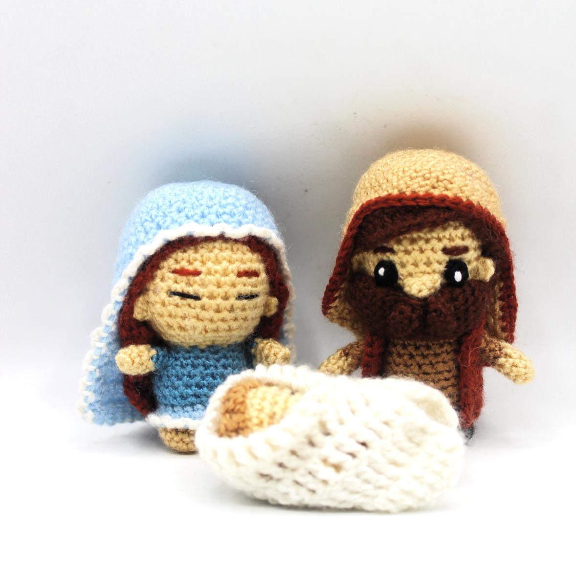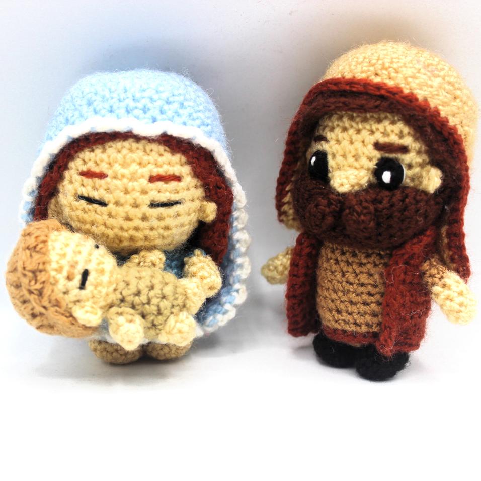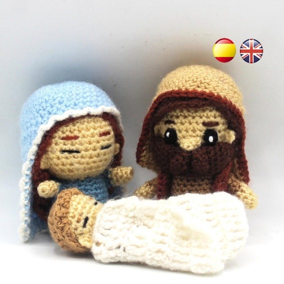 Descarga los Patrones amigurumi Sagrada Familia en formato PDF para tejer a los 3 miembros de la Sagrada familia Cristiana: La Virgen María, San José y el Niño Jesús.